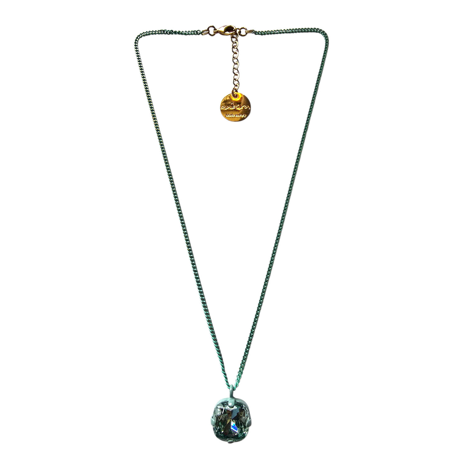 Teal and diamond-cut chain in matching color with rhinestone pendant set in a monochrome square base applied to a hypoallergenic metal frame in the same color (Teal enamel/gold). Adjustable Lobster Clasp closure with extension for size management.