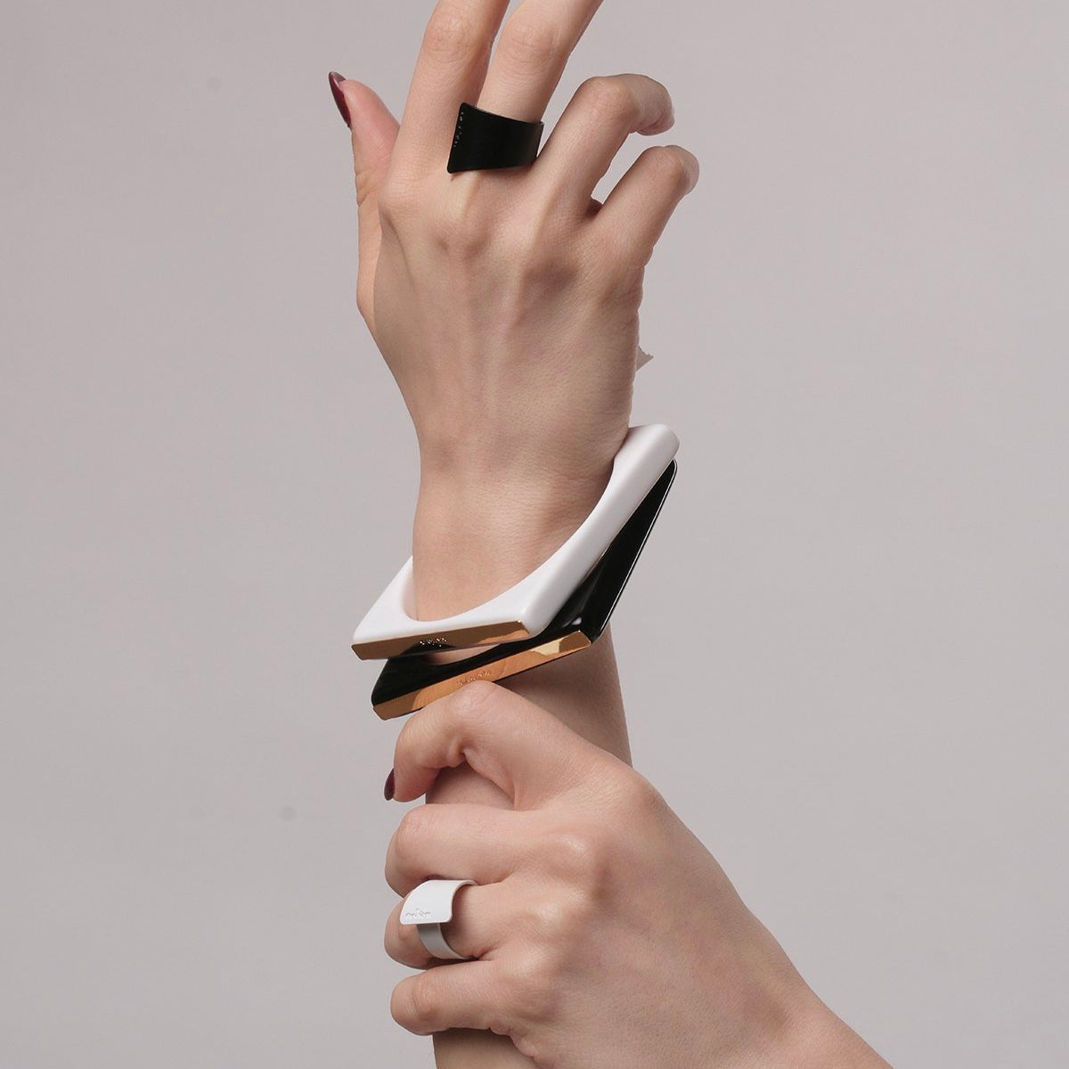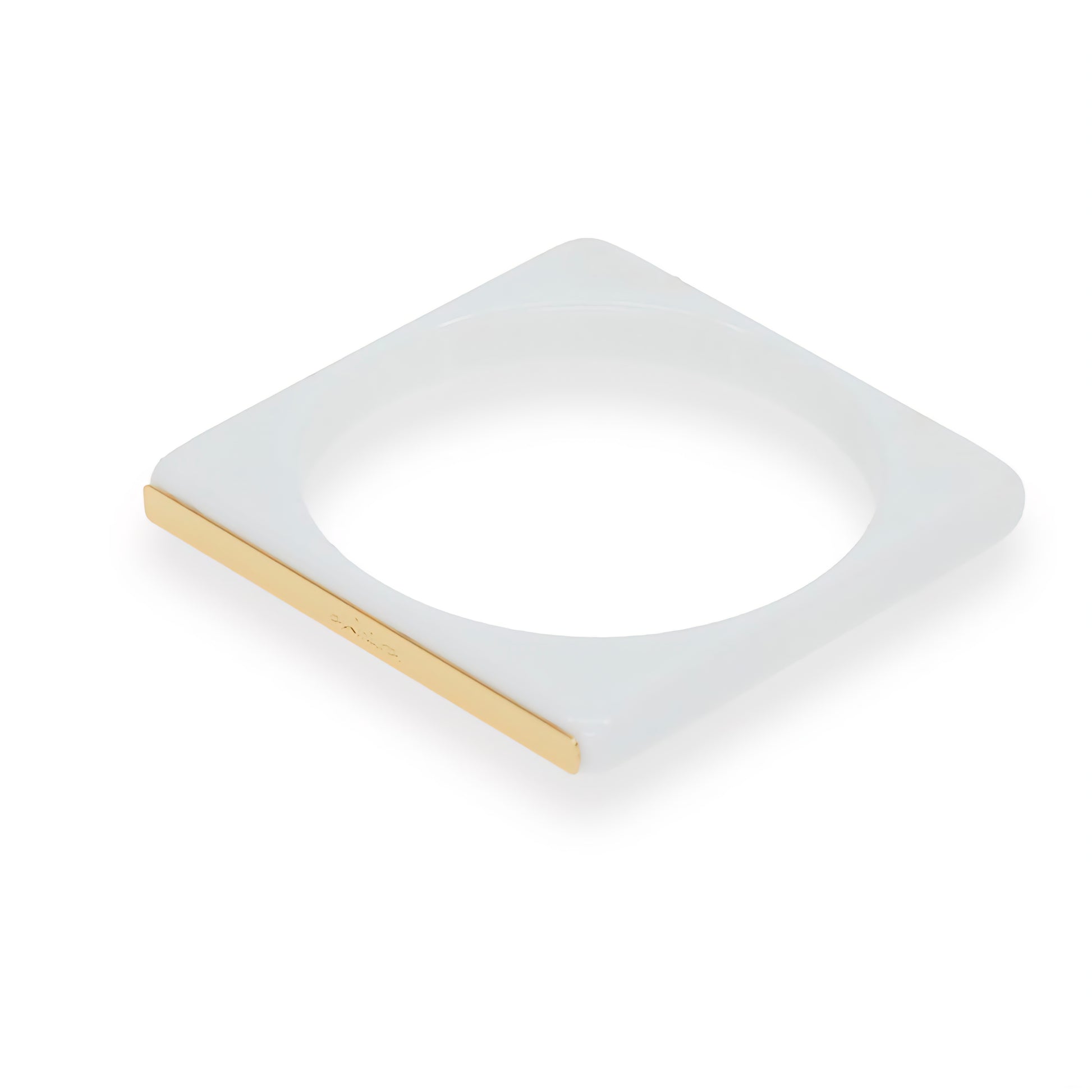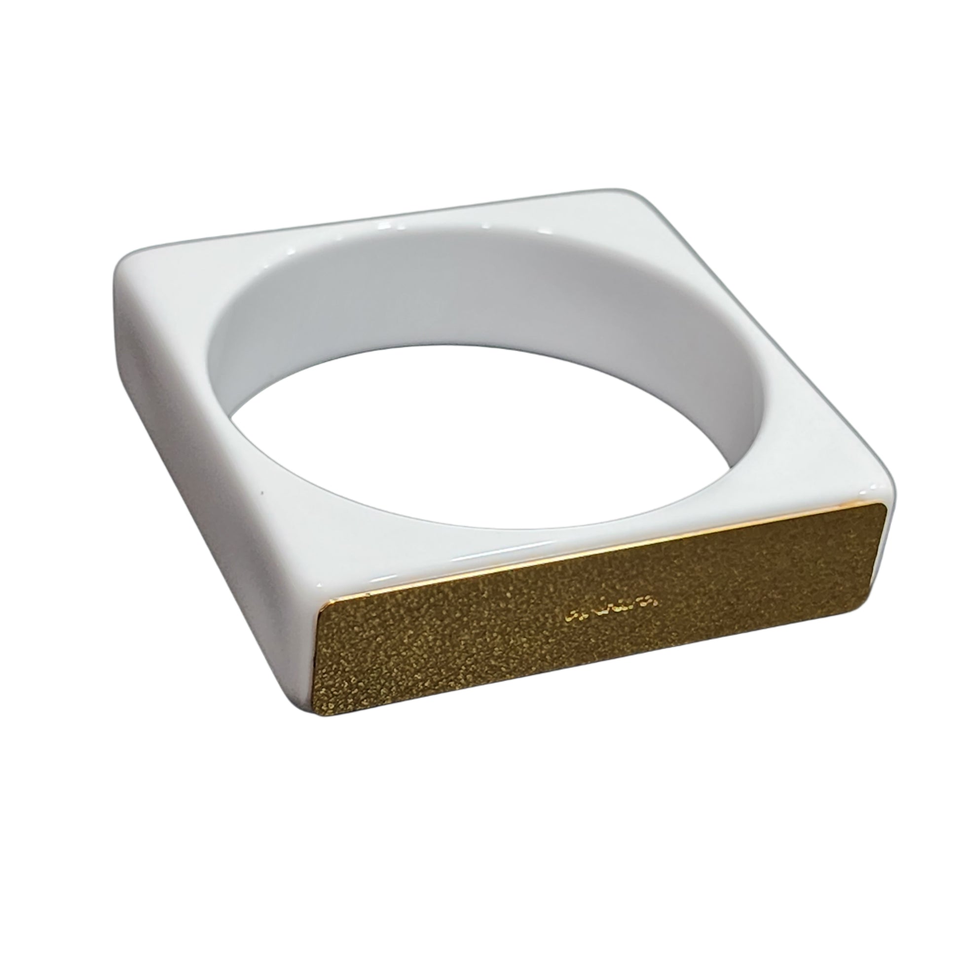Square shape solid bangles with Antura brand logo silkscreened in brass plate.