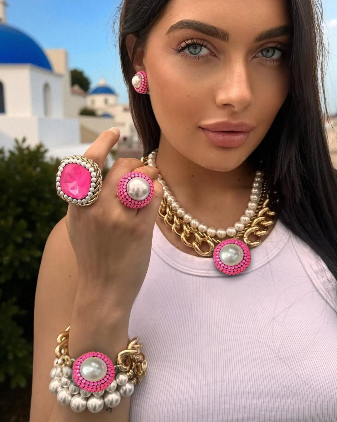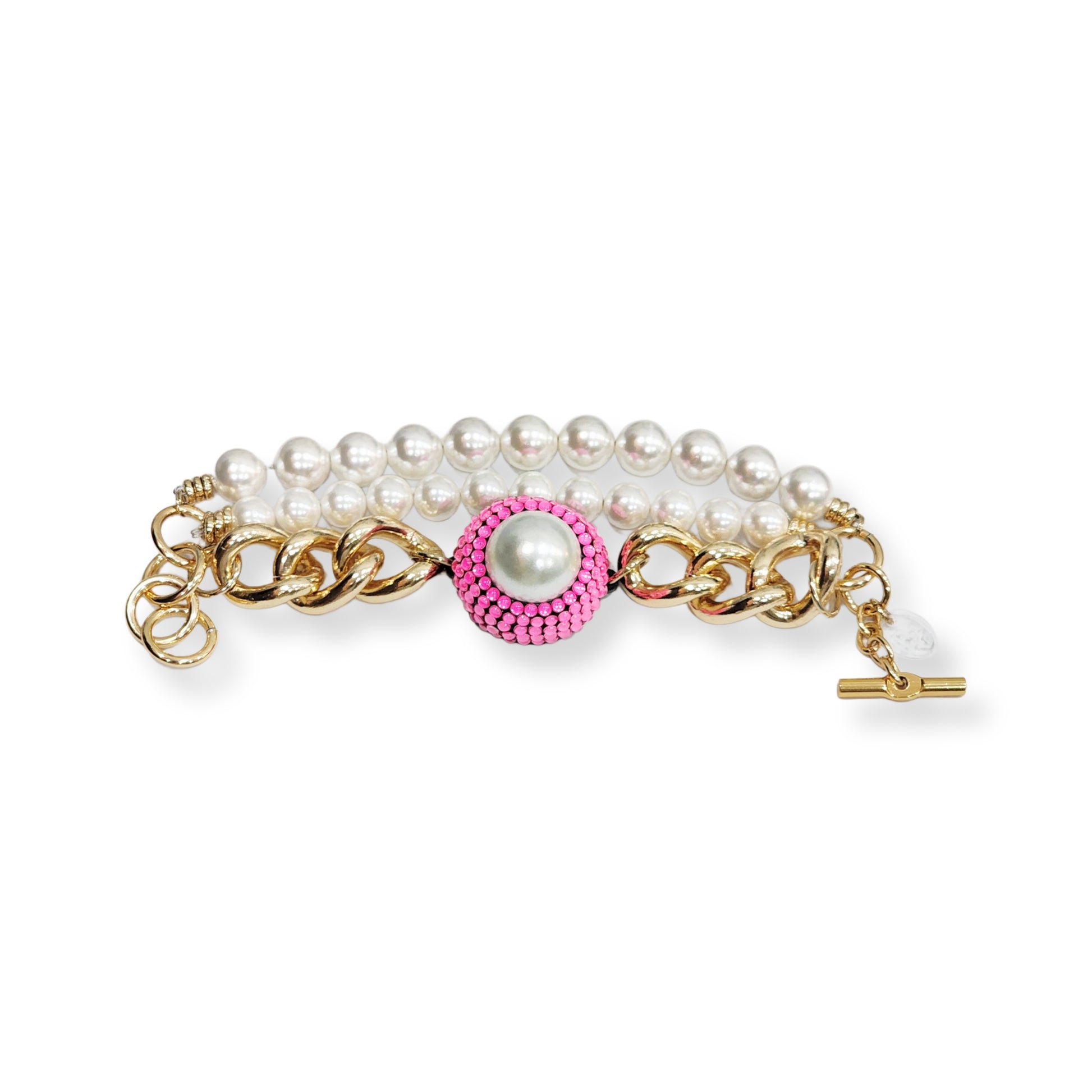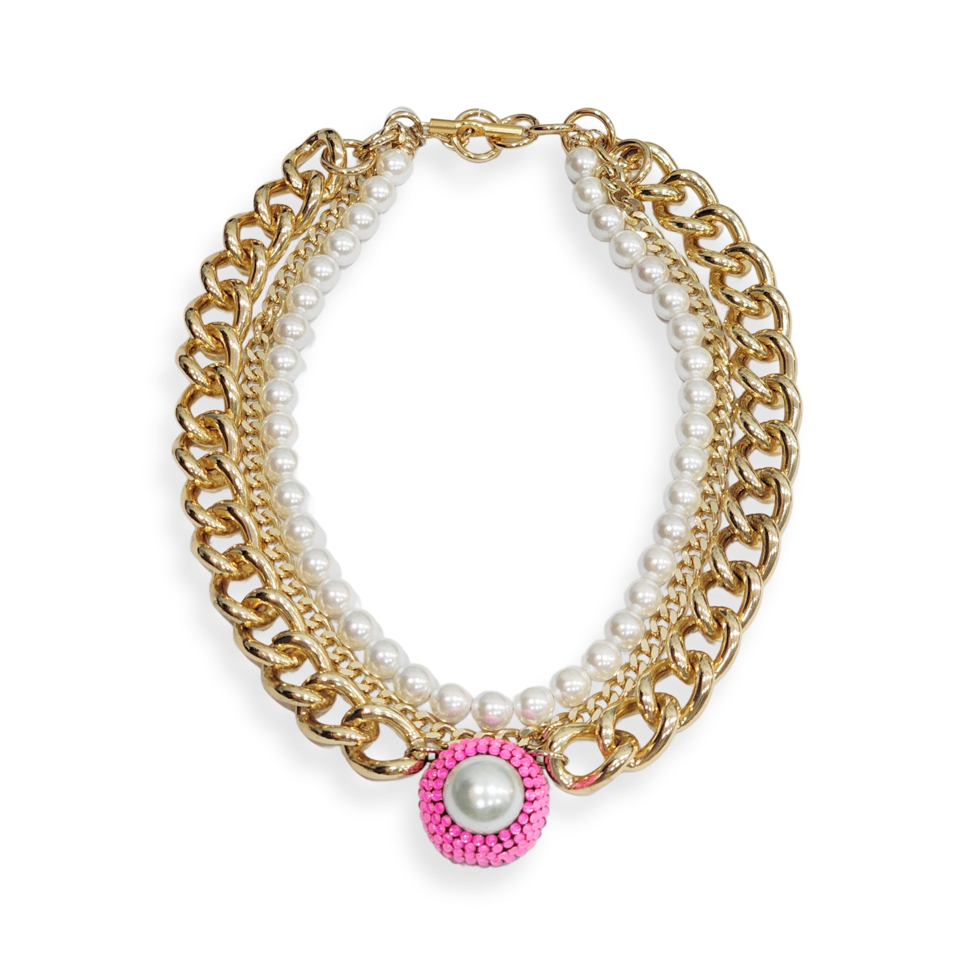 Multi-layer gold plated necklace & bracelet with Fucsia Swarovski crystal decorated with pearls. Lightweight, made of aluminum.