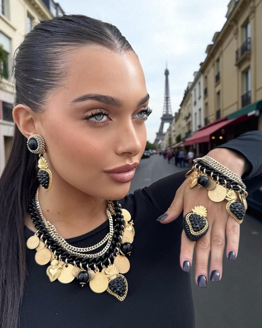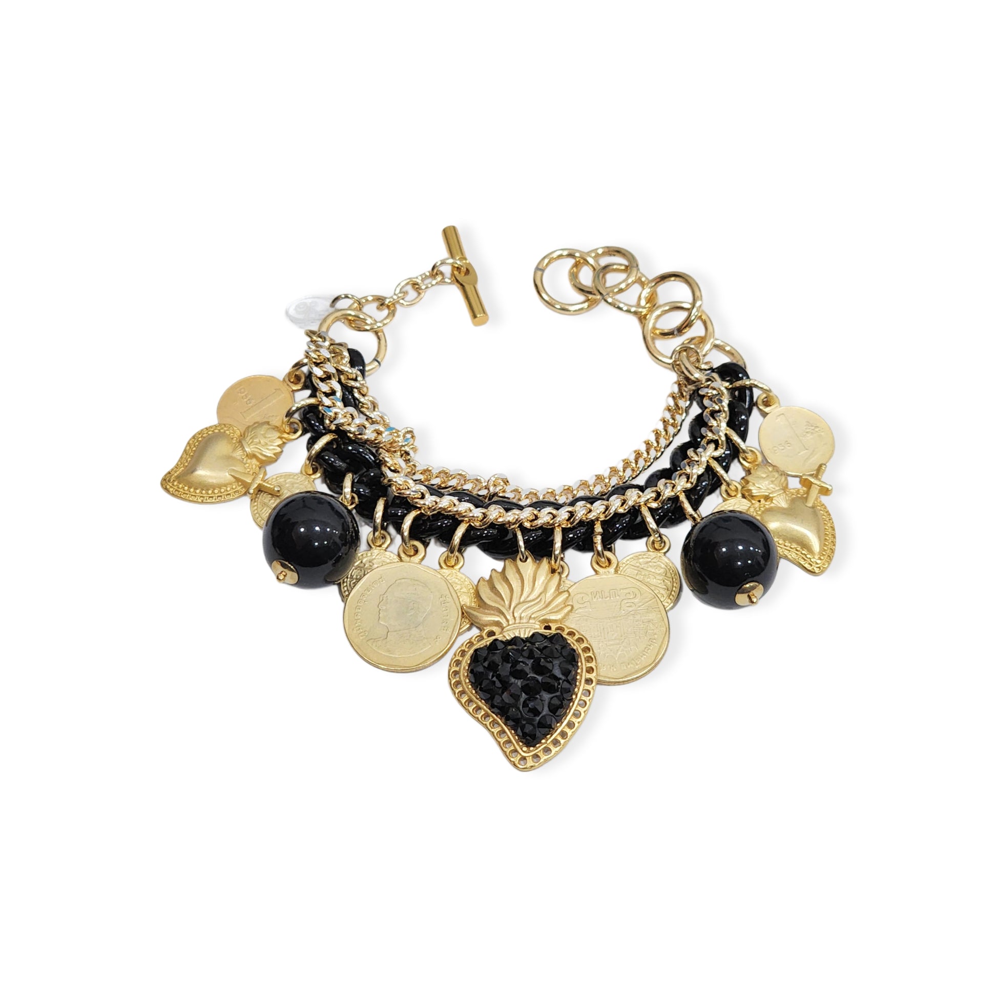 A mix of gloss black, gold and matte gold. Multi-layer necklace & bracelet with coins and hearts decorated with black Swarovski crystals. Lightweight, made of aluminum.
