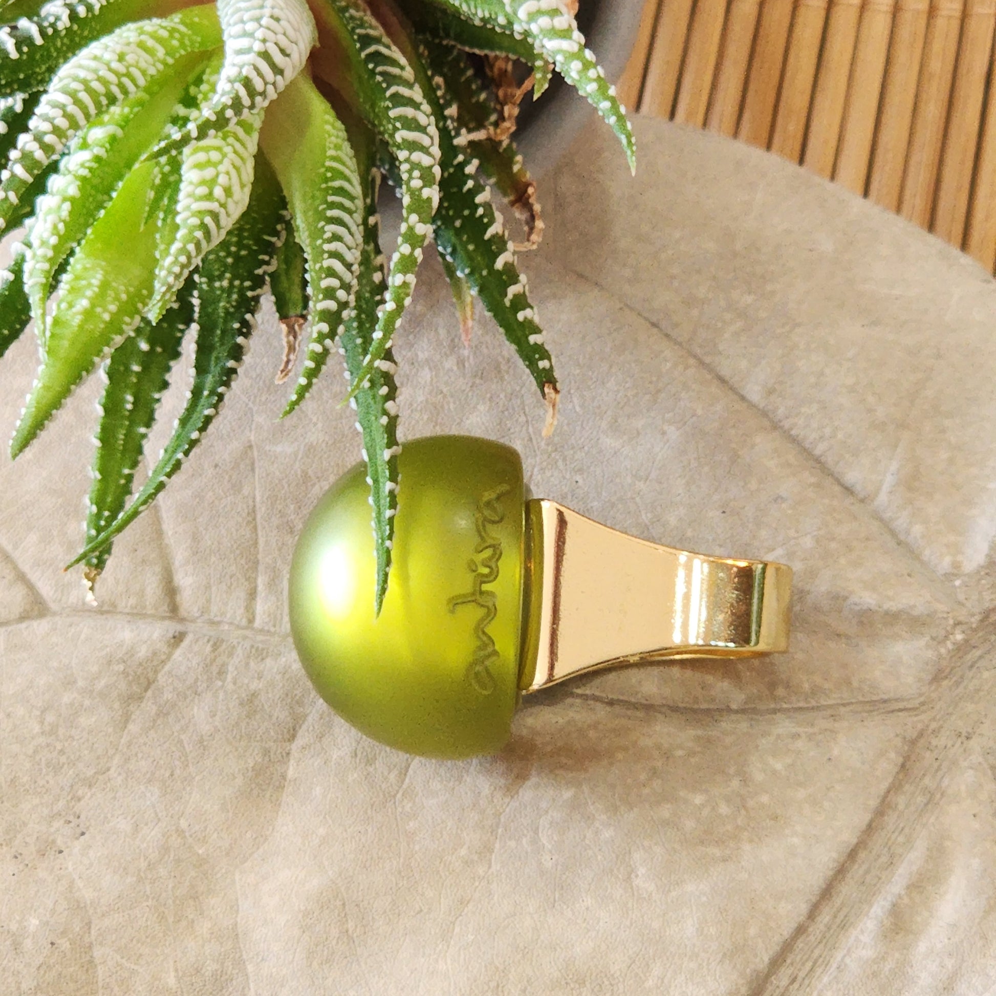 Iconic adjustable Balloon ring with a gold-plated brass frame and a semi-spherical matte resin dome. Soft-touch finish.