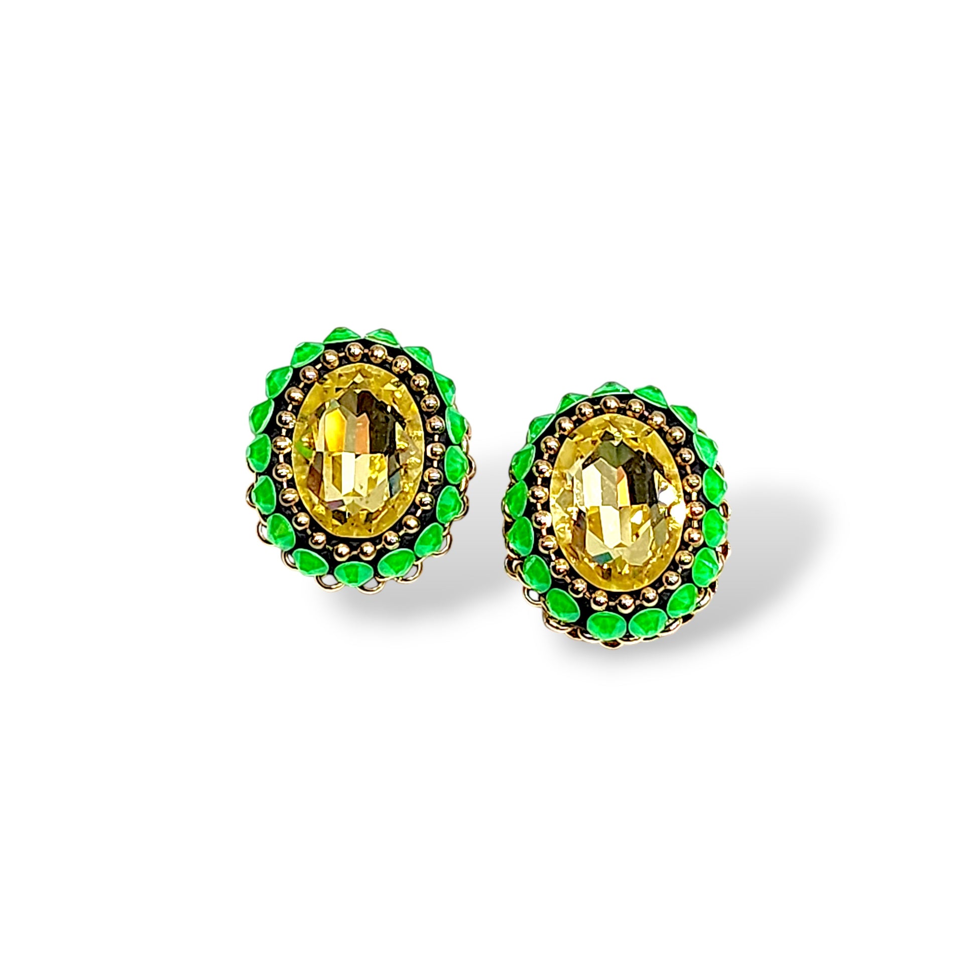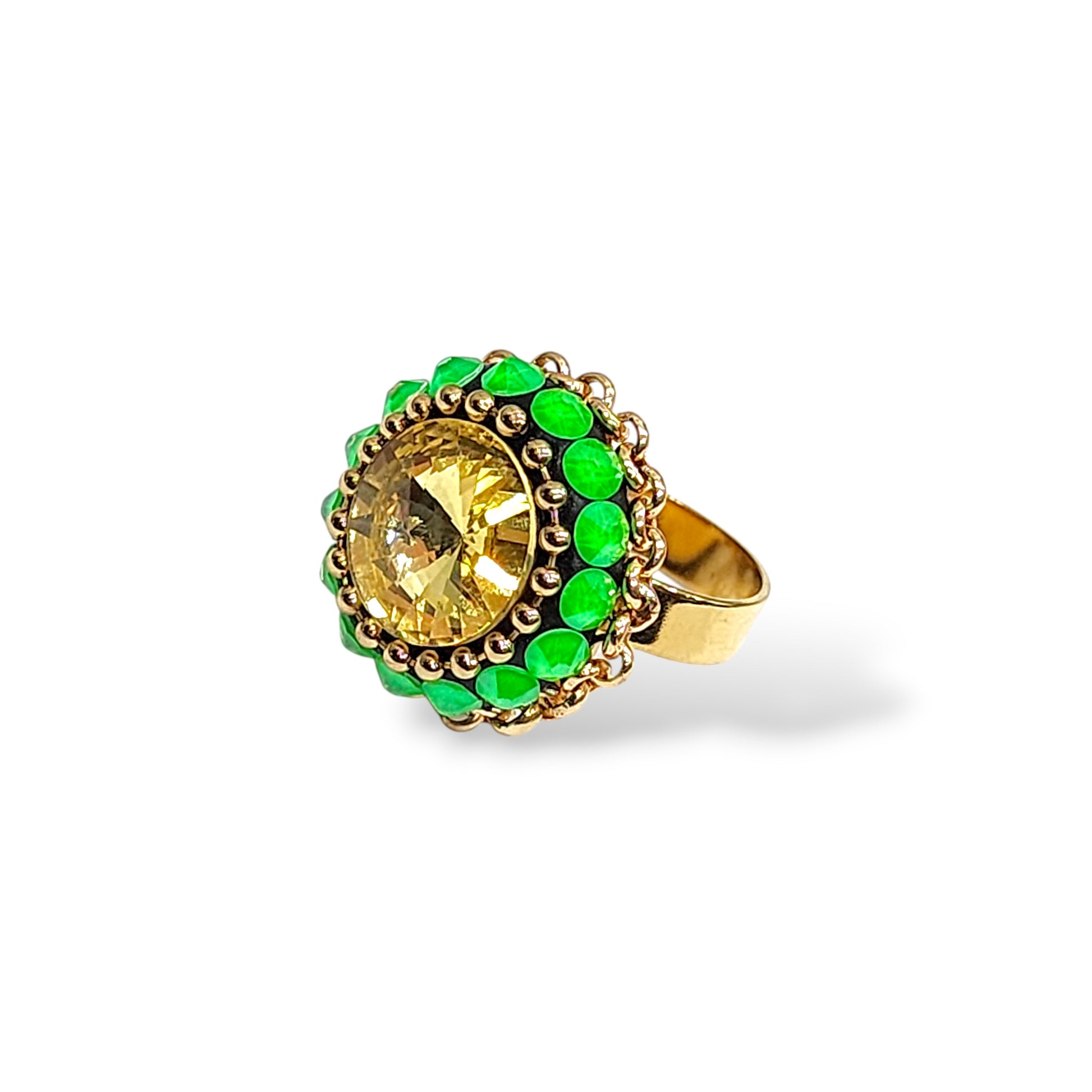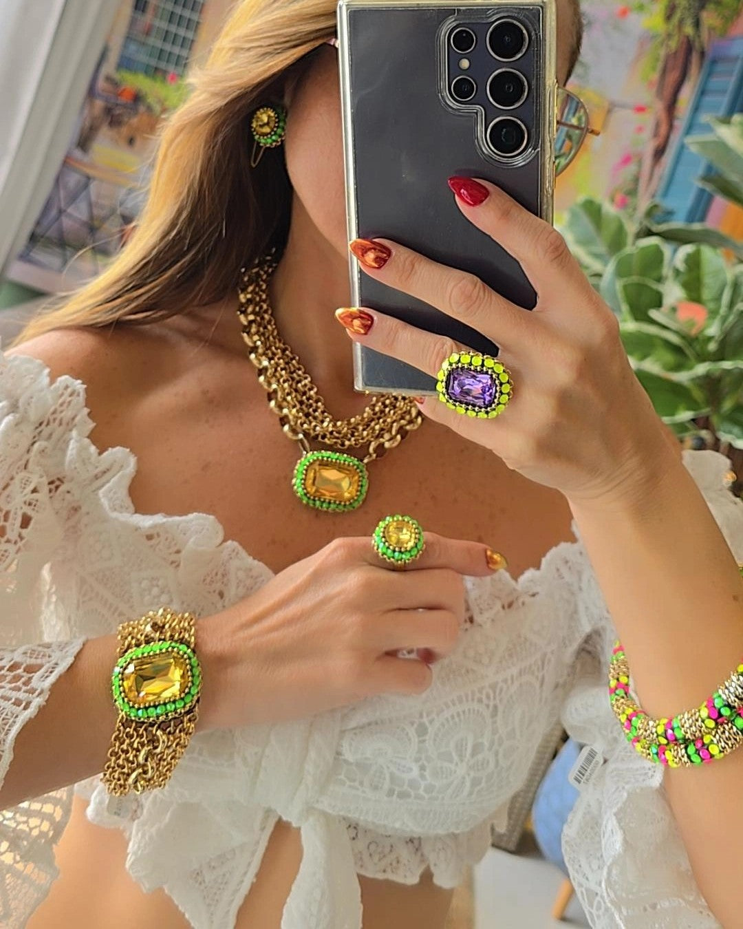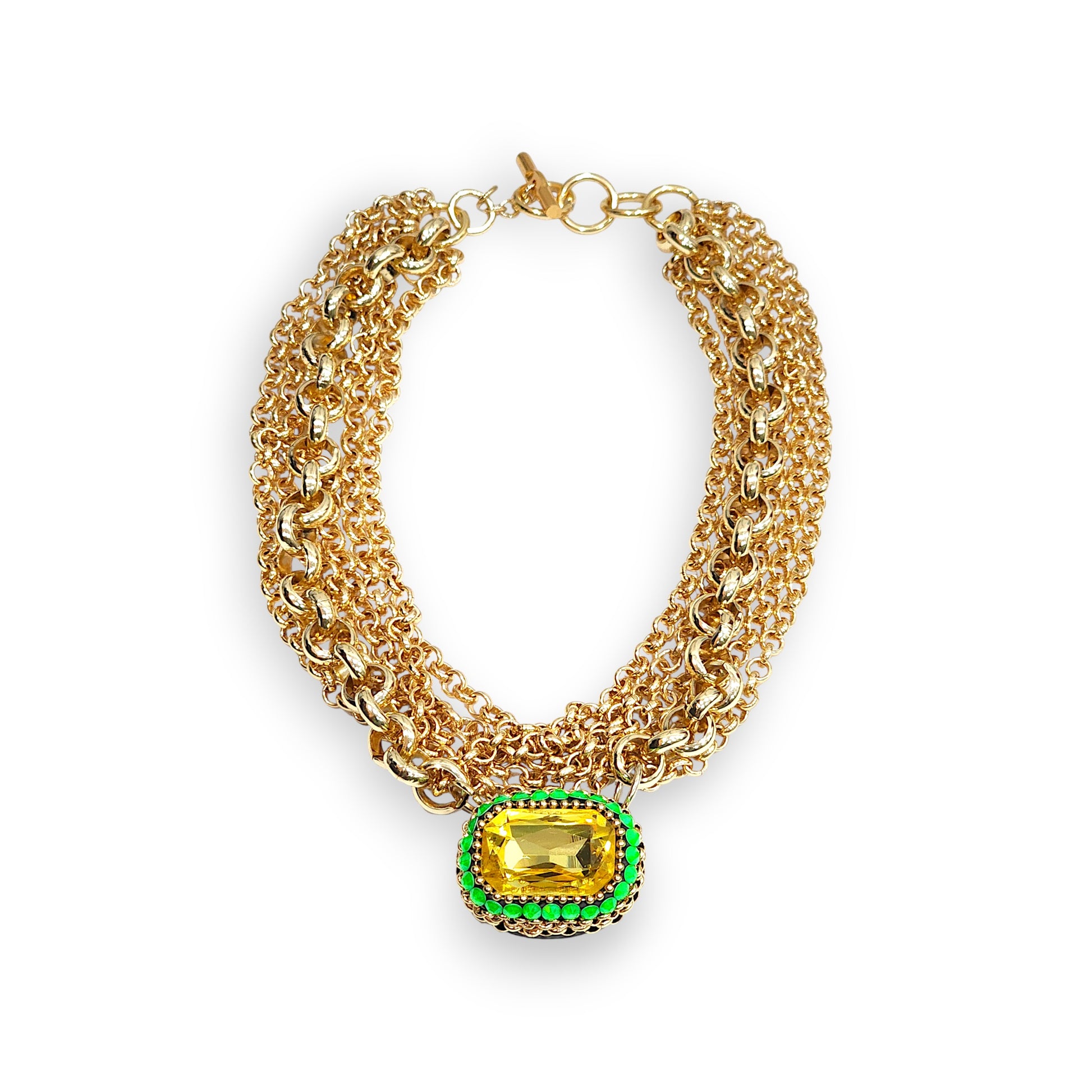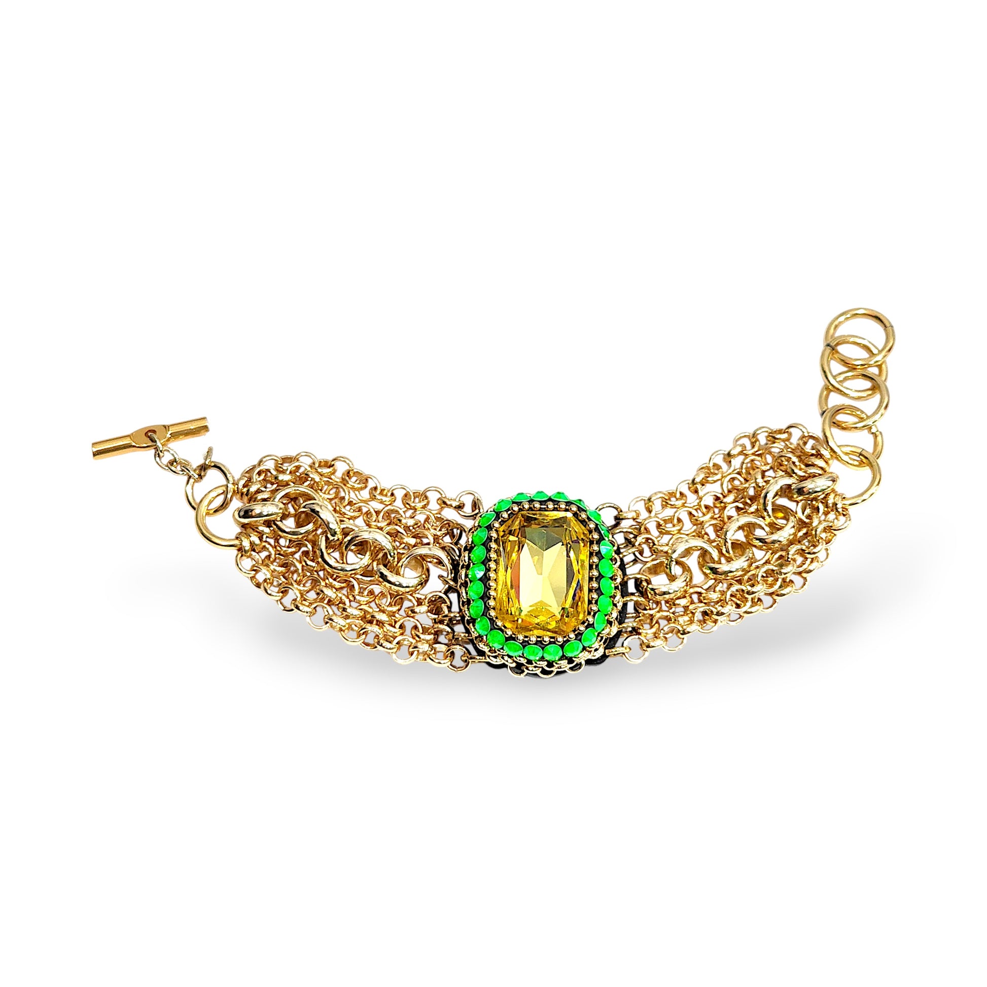 Multi-chain gold plated necklace & bracelet decorated with green and yellow Swarovski crystals.