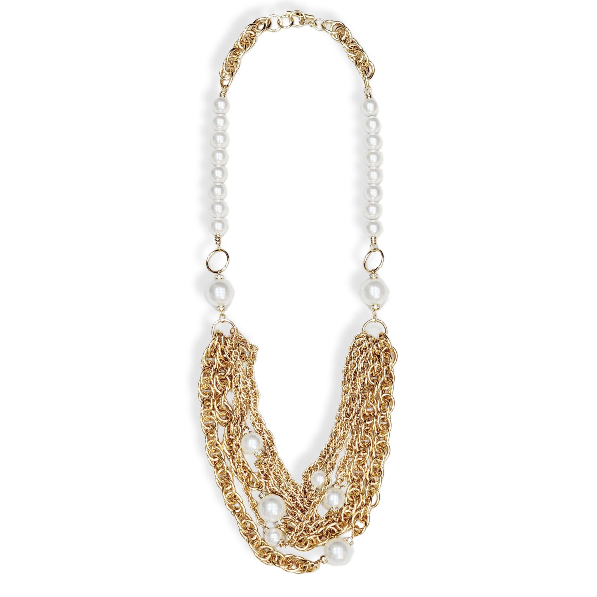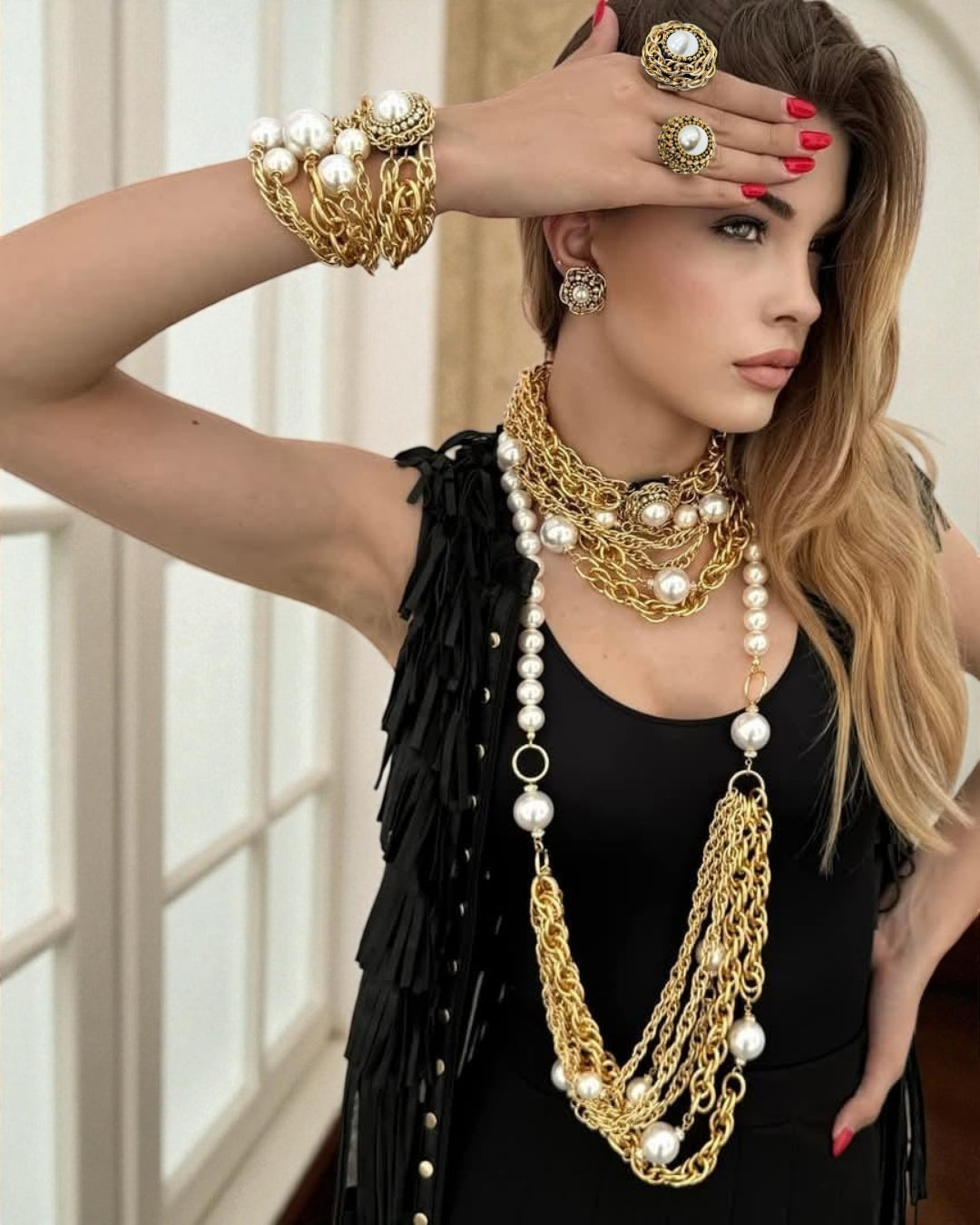 Gold plated multi-layer necklace and bracelet. Decorated with Pearls and Swarovski crystals. Lightweight, made of aluminum.