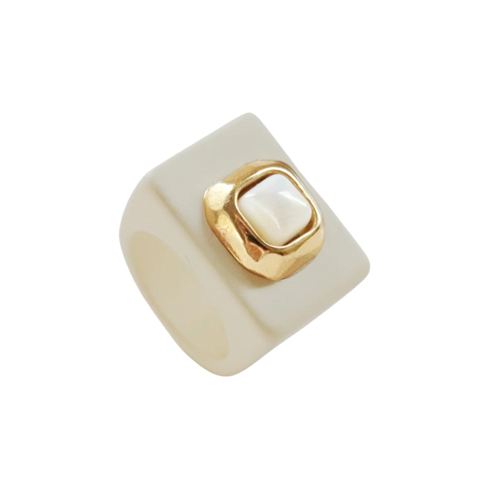 Handcrafted ring with resin base, covered with a polymer clay protective layer. Designed with natural stones on a 18k gold plated stone base.