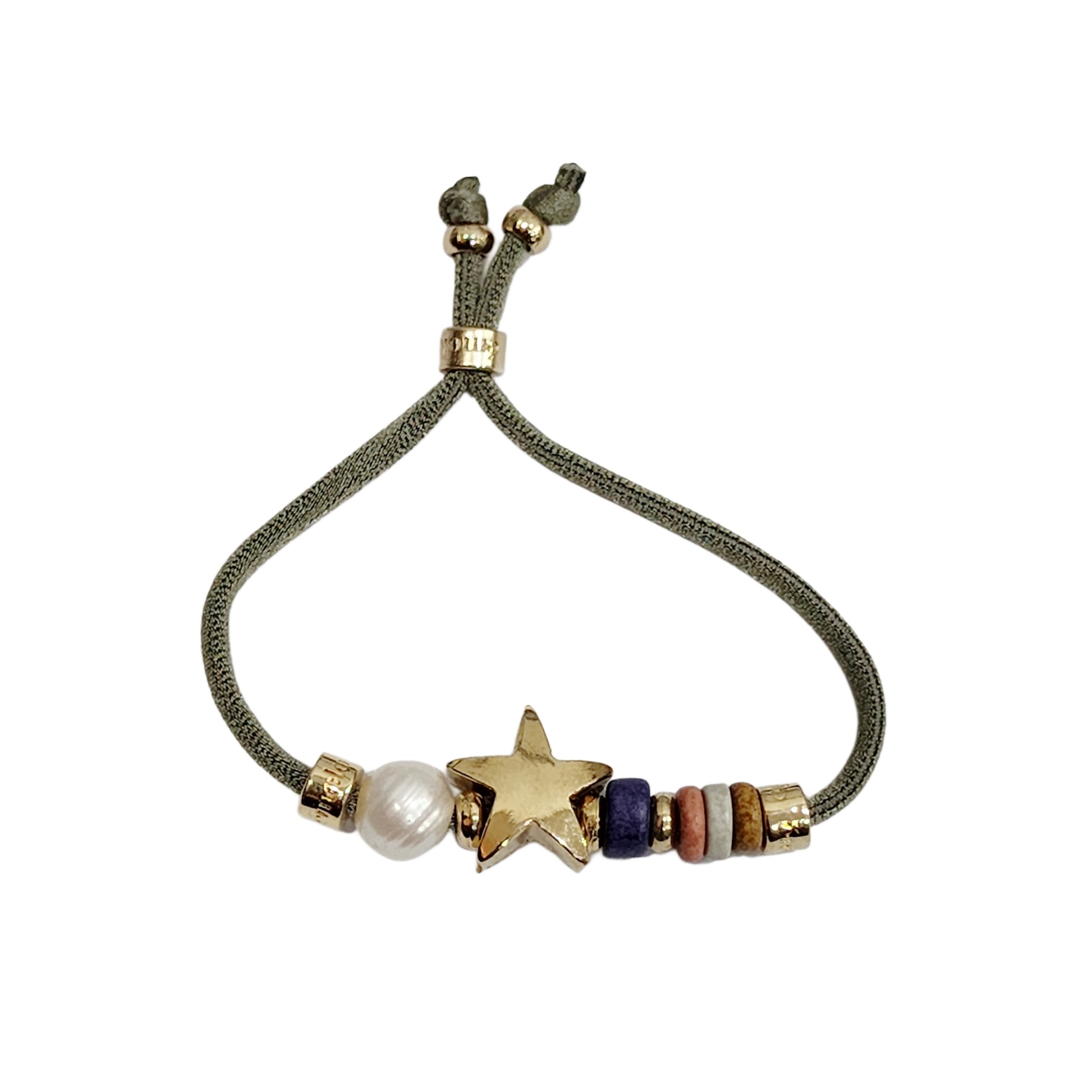 Handcrafted with elastic silk and semi-precious stones. Gold plated.